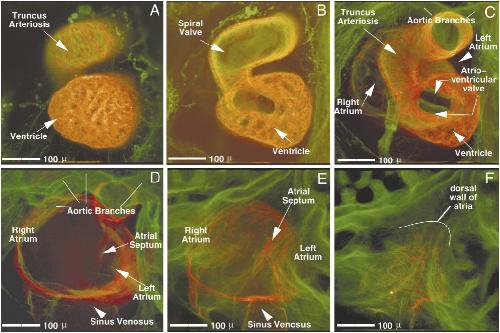 FIG. 5. Ventral-to-dorsal progression through a stage 46 Xenopus heart. Images were digitally created from a series of 48 optical sections (taken 5um apart) through a double-labeled stage 46 Xenopus heart (red, CT3; green, JB3). Image A represents the most ventral 8 images of this series, digitally merged; image B, the next 8, etc. The relative positioning of heart structures to one another, as well as an individual structure order of emergence within the series, can be established: the truncus arteriosus and ventricle are always most ventral (A). Progressing dorsally, the spiral valve (B) appears within the truncus. Next, the single atrioventricular valve (C) is seen overlying the atrial septum (D and E). Midway through the series (C and D), the first views of the atria, as well as the aortic branches, are viewed. Both atria and the sinus venosus are seen more dorsally (D and E). Finally, the back wall of the atria is seen, positioned most dorsal (F). Scale bar, 100 um. Image published in: Kolker SJ et al. (2000) Copyright © 2000. Image reproduced with permission of the Publisher, Elsevier B. V.