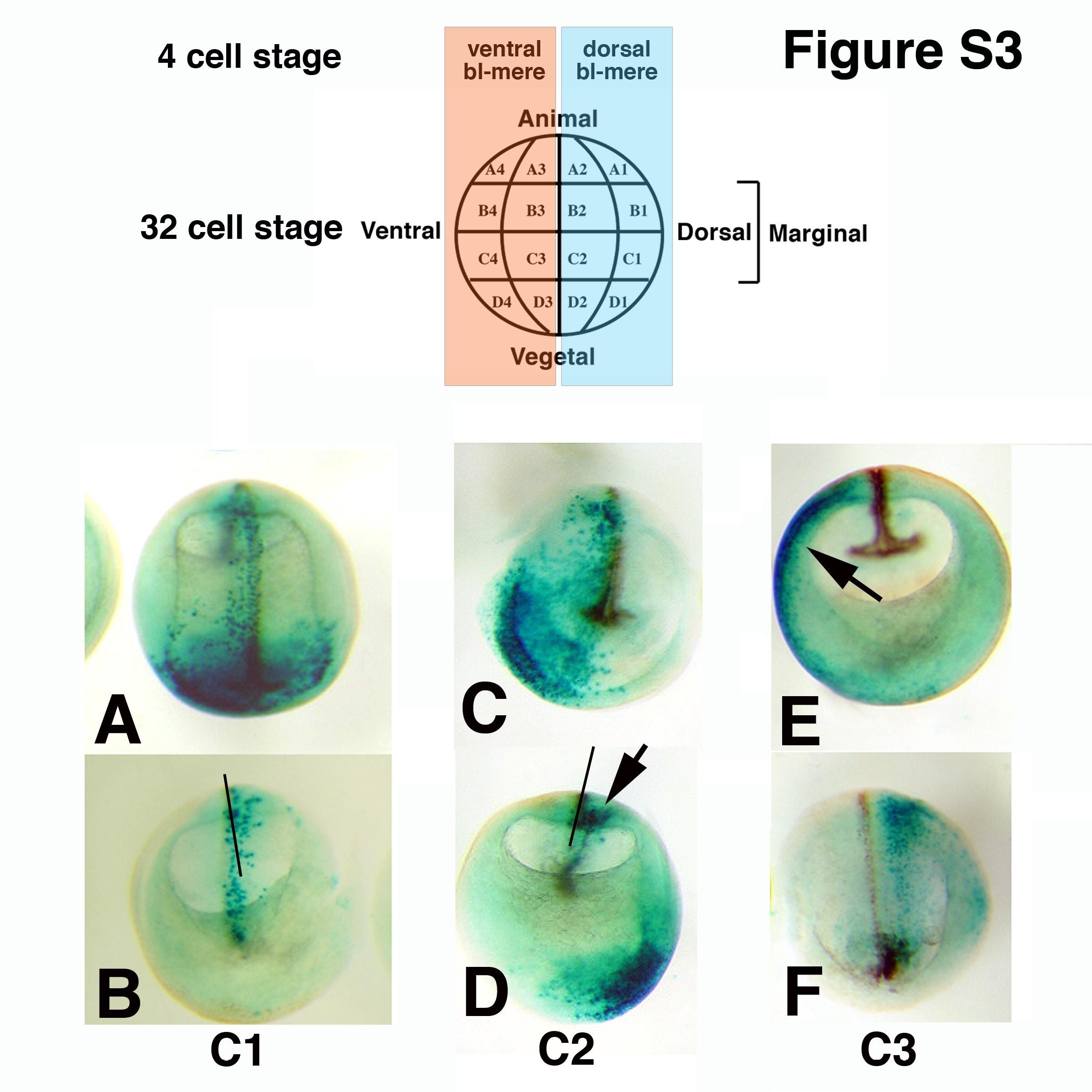 Supplementary Fig. S3. Cell fate of tier C blastomeres from 32 cell stage embryos, at stage 18. 32 cell stage embryos (upper panel, nomenclature of Nakamura, descendents of the dorsal blastomere from 4 cell stage in light blue, and of the ventral blastomere in pink) were injected in blastomeres C1, C2 (dorsal descendents) and C3 (ventral descendent) with 2 ng LacZ RNA, collected at stage 18, and stained with X-Gal (blue dots). All embryos are cleared. A, B. C1 injection. A: dorsal view. B: sectioned posterior half, internal view. Most of the tracer migrates to the anterior pole, the rest is mostly axial, with some contribution to posterior paraxial mesoderm. C, D. C2 injection. C: anterior half, external view. D: posterior half, internal view. Arrow in D indicates tracer in ventral paraxial mesoderm. E, F. C3 injection. E: anterior half, internal view. Arrow indicates lateral plate mesoderm. F: posterior half, external view. Tracer is lateral to the posterior paraxial mesoderm. Bars in B and D indicate the midline. Image published in: Vonica A and Brivanlou AH (2007) Copyright © 2007. Image reproduced with permission of the Publisher, Elsevier B. V. Larger Image Printer Friendly View |