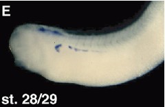 lbx1 (ladybird homeobox 1) gene expression in Xenopus laevis embryo via in situ hybridization, NF stage 28, lateral view, anterior left. This image is extracted from figure published in: Martin BL and Harland RM (2006), Image published in: Martin BL and Harland RM (2006) Copyright © 2006. Image reproduced with permission of the Publisher and the copyright holder. This is an Open Access article distributed under the terms of the Creative Commons Attribution License.