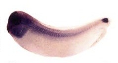 not (notochord homeobox) gene expression in Xenopus laevis embryo, assayed via in situ hybridization, NF stage 29 & 30, lateral view, anterior left, dorsal up. Image published in: Choi SC and Han JK (2002) Copyright © 2002. Image reproduced with permission of the Publisher, Elsevier B. V.