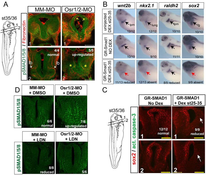 Fig. S7. BMP/pSMAD1 signaling is upregulated in Osr1/2-depleted embryos and temporal Smad1 overexpression can inhibit lung specification. (A) Immunofluorescence analysis of phospho-SMAD1/5/8 (green) and fibronectin (red) at stage35/36 in Osr1/2-MO bilaterally injected embryos. Section 1 through the foregut is anterior to section 2. Yellow arrows indicate ectopic pSMAD1/5/8 in dorsal foregut endoderm, and yellow asterisks indicate ectopic pSMAD1/5/8 and reduced fibronectin at the level of the nascent lung buds. (B) Embryos were injected with RNA encoding a hormone-inducible GR-Smad1 (800 pg) at the four/eight-cell stage into 1 side of the embryo. Between stages 25 and 35, embryos were treated with or without 1 µM dexamethasone (dex) to activate the construct, thus inducing active BMP signaling. In situ hybridization at stage 35 shows that activated GR-Smad1 is inhibitory to wnt2b, nkx2.1 and sox2 expression. (C) Overexpression of GR-SMAD1 does not cause cell death. Embryos were injected and treated as in B, and analyzed at stage 35/36 by immunofluorescence for Sox2 (red) and activated caspase 3 (green). No cell death was detectable in either condition. (D) LDN treatment rescues the elevated pSMAD1/5/8 signaling observed in Osr1/2-MO embryos. Embryos were injected as in A and treated from stages 25-35 with DMSO vehicle or 10 µM LDN193189 and assayed by immunofluorescence for phospho-SMAD1/5/8 (green). Image published in: Rankin SA et al. (2012) Copyright © 2012. Image reproduced with permission of the Publisher.
