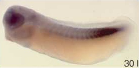 | itgb1bp2 (integrin beta 1 binding protein (melusin) 2) gene expression in Xenopus tropicalis embryos, NF stage 30, as assayed by in situ hybridization. Lateral view: anterior left, dorsal up. This image is extracted from figure published in: Chen JA et al. (2005), Image published in: Chen JA et al. (2005) Copyright © 2005. Image reproduced with permission of the Publisher, Elsevier B. V.