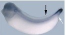hoxa13 (homeobox A13) gene expression in Xenopus laevis embryo, assayed via in situ hybridization, NF stage 32, lateral view, anterior left, dorsal up. Image published in: Lombardo A and Slack JM (2001) Copyright © 2001. Image reproduced with permission of the Publisher, Elsevier B. V.