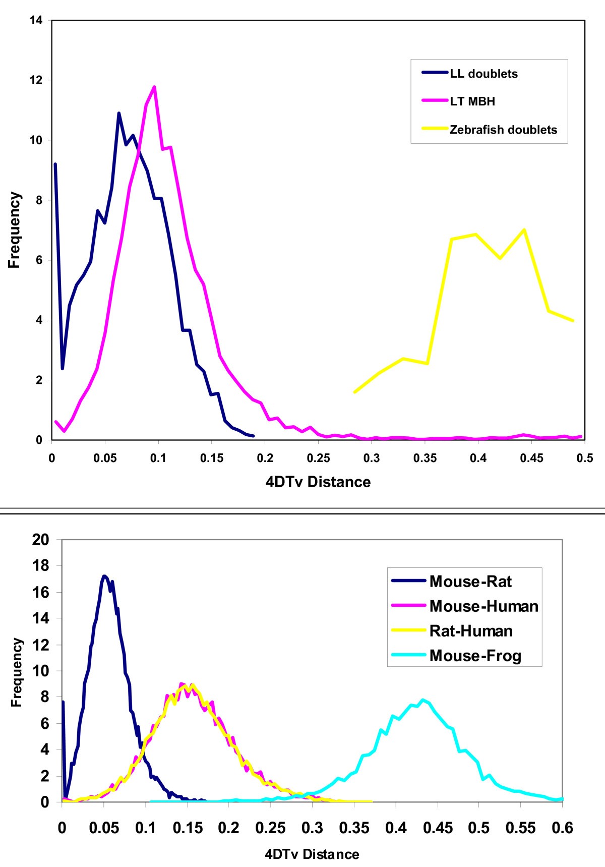 Figure 1. Four-fold synonymous transversion rates. (a) X. tropicalis-X. laevis mutual-best hits (LT MBH) show 4 DTv distances sharply peaked around 0.09 corresponding to the species divergence. The few hits in the high-end tail (4 DTv > 0.2) are due to the incompleteness of the gene sets and/or gene losses. The line marked LL doublets shows two-member clusters of recent (4 DTv < 0.15) X. laevis paralogs. Assuming uniform transversion rates across vertebrates, and dating the last common human-mouse ancestor at 75 Mya, the laevis-tropicalis and laevis-laevis divergence is ~50 and ~40 Mya, respectively. For comparison, paralogs from the much more ancient teleost duplication in zebrafish are also shown. After correcting for multiple transversions, the fish duplication is about eight times older than the X. laevis event, consistent with timings based on total synonymous substitution rates [13,14]. (b) 4 DTv distributions for orthologs in mouse-rat (red), mouse-human (blue), rat-human (green), and mouse-X. tropicalis (purple). Only orthologs supported by conserved synteny are considered. Using the same molecular clock as panel (a), the mammal-frog divergence is 350 Mya. Image published in: Hellsten U et al. (2007) Copyright © 2007 Hellsten et al; licensee BioMed Central Ltd. Creative Commons Attribution license Larger Image Printer Friendly View |