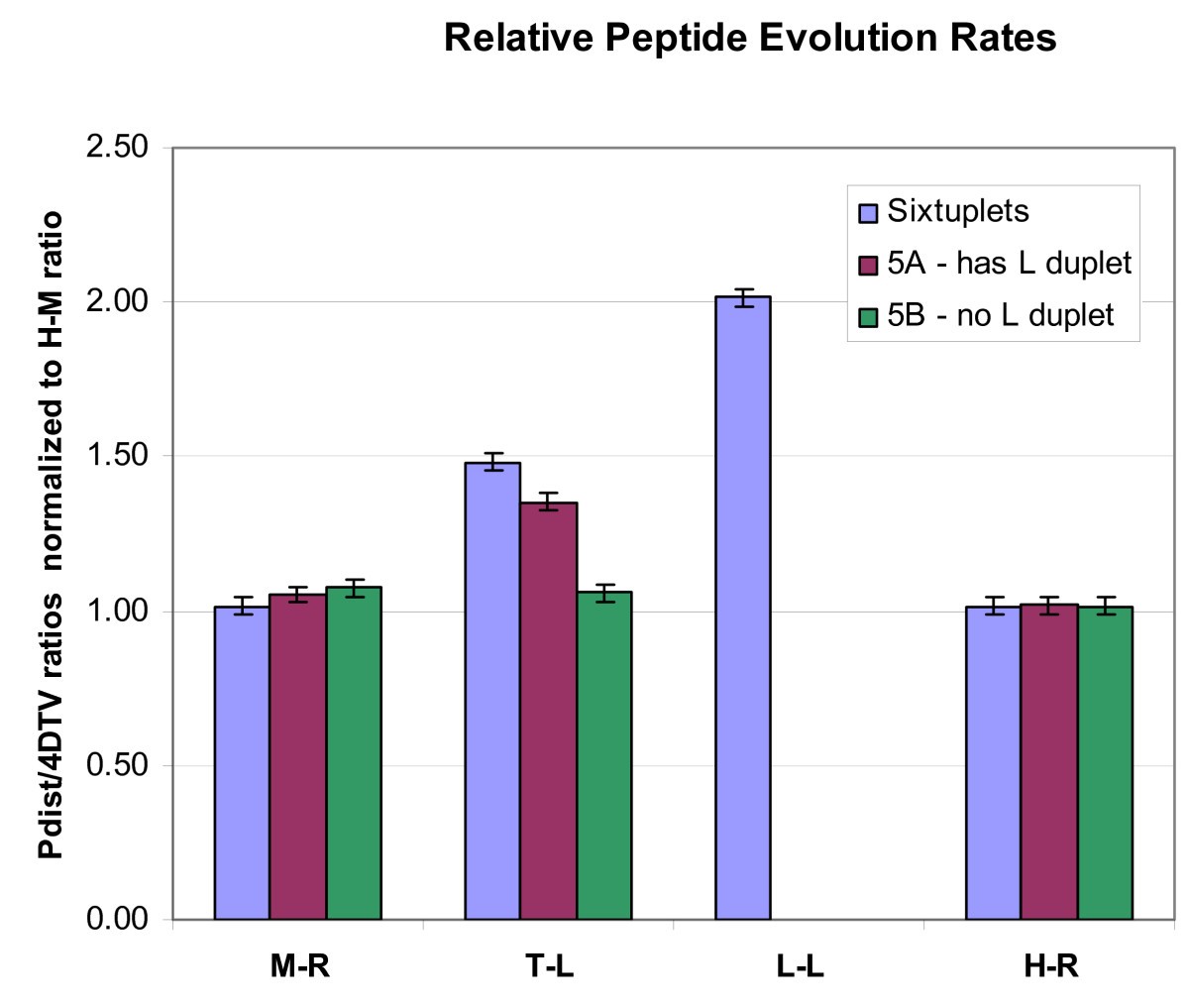 |   | Figure 3. Normalized peptide to nucleotide evolutionary rates show an accelerated divergence of duplicated X. laevis peptides. The chart shows the ratio of peptide evolution (P-distance) to synonymous transversion rates (4 DTv), normalized by the human-mouse P-distance/4 DTV value of 0.242 � 0.004, for three sets of multiple alignments corresponding to genes found in single copy in each of human, mouse, rat, and X. tropicalis, and two copies in X. laevis (sextuplets); pentuplets obtained by randomly selecting one X. laevis paralog from each sextuplet (5 A), and pentuplets in which only a single X. laevis sequence is known (5B). Image published in: Hellsten U et al. (2007) Copyright © 2007 Hellsten et al; licensee BioMed Central Ltd. Creative Commons Attribution license Larger Image Printer Friendly View |