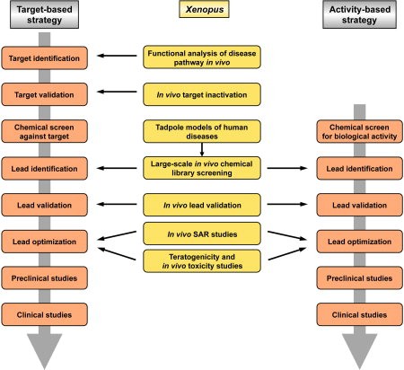 Figure 3. The utility of Xenopus in drug discovery and development. The two broad strategies of drug discovery and development are shown. The target-based strategy requires a functional understanding of the disease pathway to determine target genes or proteins for drug discovery and development. The activity-based strategy selects for drug candidates on the basis of biological activities implicated with a therapeutic benefit. The Xenopus embryos and tadpoles can serve as cheap and efficient bioassay tools at several stages of the drug-discovery process regardless of the strategy chosen. SAR, structure-activity-relationship.Download figure to PowerPoint Image published in: Wheeler GN and Brändli AW (2009) Copyright © 2009. Image reproduced with permission of the Publisher, John Wiley & Sons. Larger Image Printer Friendly View |