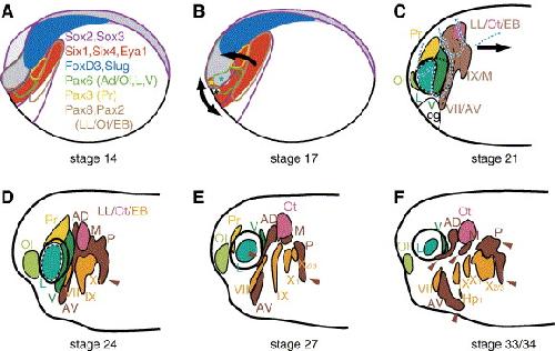 | Fig. 4. Summary of placodal development in Xenopus laevis in lateral views (modified from Schlosser and Ahrens, 2004; stages after Nieuwkoop and Faber, 1967). (A, B) Gene expression domains (colored outlines) during neural plate (A) and neural fold stages (B). The panplacodal primordium (red) is apposed to the neural plate (gray) anteriorly and to neural crest (blue) laterally (see also Fig. 3C). Arrows in panel B indicate shifts of placodal expression domains due to neural fold elevation (dorsal shift) and wedge-like expansion of anterior ectoderm accompanying the formation of the optic vesicles. Green stars identify three areas of Pax6 expression that will contribute (from anterior to posterior) to adenohypophyseal and olfactory placode (light green), lens placode (blue green), and trigeminal placode (dark green). Six1 and Eya1 expressions are downregulated at neural fold stages in the regions of prospective lens placode and cement gland (black asterisk). (CâF) Development of placodes after neural tube closure until late tailbud stages. Drawings are based on reconstructions of ectodermal thickenings from serial sections (after Schlosser and Ahrens, 2004; Schlosser and Northcutt, 2000). The adenohypophyseal placode, which is located medial to the ventral part of the olfactory placode, is not shown in these lateral views. Various green colors identify placodes or prospective placodes expressing Pax6, yellow identifies the profundal placode expressing Pax3, and brown, pink, and orange jointly identify the posterior placodal area expressing Pax2 and Pax8, with pink being reserved for the subregion forming the otic placode/ vesicle and orange for the subregions forming the epibranchial placodes. At stage 21, the posterior placodal area is divided into an anterior and a posterior subregion of thickened ectoderm, separated ventrally by an indentation and dorsally by a region of thinner ectoderm (between broken black lines), while the prospective otic placode (pink) is identifiable as a particularly prominent thickening. The broken blue lines in panel C indicate neural crest streams as reconstructed from serial sections (Schlosser and Northcutt, 2000). The arrow in panel C indicates that the posterior placodal area expands posteriorly at early tailbud stages. Brown arrowheads in panels DâF indicate developing lateral line primordia. Abbreviations: Ad/Ol: anterior placodal area, from which adenohypophyseal (Ad) and olfactory placodes (Ol) develop; AV: anteroventral lateral line placode; cg: cement gland; Hp1: first hypobranchial placode; L: prospective lens placode (hatched outline), lens placode or lens (invagination of placode between stage 27 and 33/34); LL/Ot/EB: posterior placodal area, from which lateral line (LL), otic (Ot), and epibranchial (EB) placodes develop; M: middle lateral line placode; Ol: olfactory placode; Ot: otic placode or vesicle (invagination of placode between stage 24 and 33/34); P: posterior lateral line placode; Pr: profundal placode; V: trigeminal placode; VII: facial epibranchial placode; IX: glossopharyngeal epibranchial placode; X1: first vagal epibranchial placode; X2/3: second and third vagal epibranchial placodes (fused). Image published in: Schlosser G (2006) Copyright © 2006. Image reproduced with permission of the Publisher, Elsevier B. V. Larger Image Printer Friendly View |