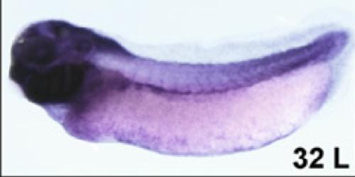 snrpd1 (mall nuclear ribonucleoprotein D1 polypeptide 16kDa) gene expression in Xenopus tropicalis embryo, assayed via in situ hybridization, NF stage 32, lateral view, anterior left, dorsal up. Image published in: Kyuno J et al. (2008) Copyright © 2008. Image reproduced with permission of the Publisher, Elsevier B. V.