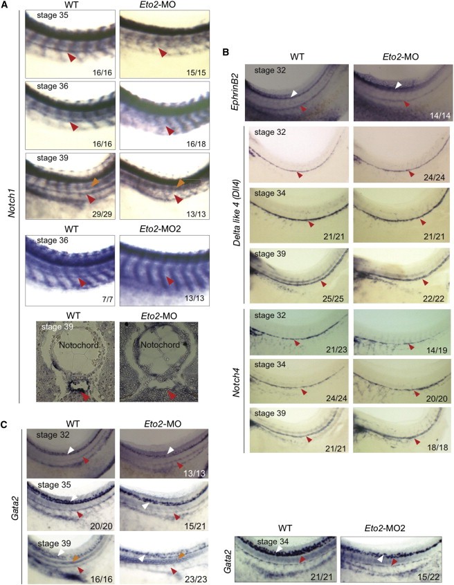 |   | Figure 2. ETO2 Is Specifically Required for the Establishment of the Hematopoietic Program in the DA(A) Notch1 is absent in the DA of Eto2-MO and Eto2-MO2 morphants (stages 35/36/39, WMISH, and stage 39 bottom, ISHS; red arrowheads, DA; orange arrowheads, notochord).(B and C) Expression analysis of arterial-affiliated genes EphrinB2, Delta-like4 (Dll4), and Notch4 (B), as well as Gata2 (C) in the presumptive DA (stage 32) and in the DA (stages 34â39) in Eto2 morphants, red arrowheads. White and orange arrowheads: neural tube and notochord, respectively.Numbers in the bottom of the panels denote the number of embryos as shown in the panel out of the total examined. Whole mounts are shown with anterior to the left and dorsal to the top. Sections are in transverse orientation with dorsal to the top. See also Figures S2A and S4. Image published in: Leung A et al. (2013) © 2013 ELL & Excerpta Medica. Creative Commons Attribution license Larger Image Printer Friendly View |
