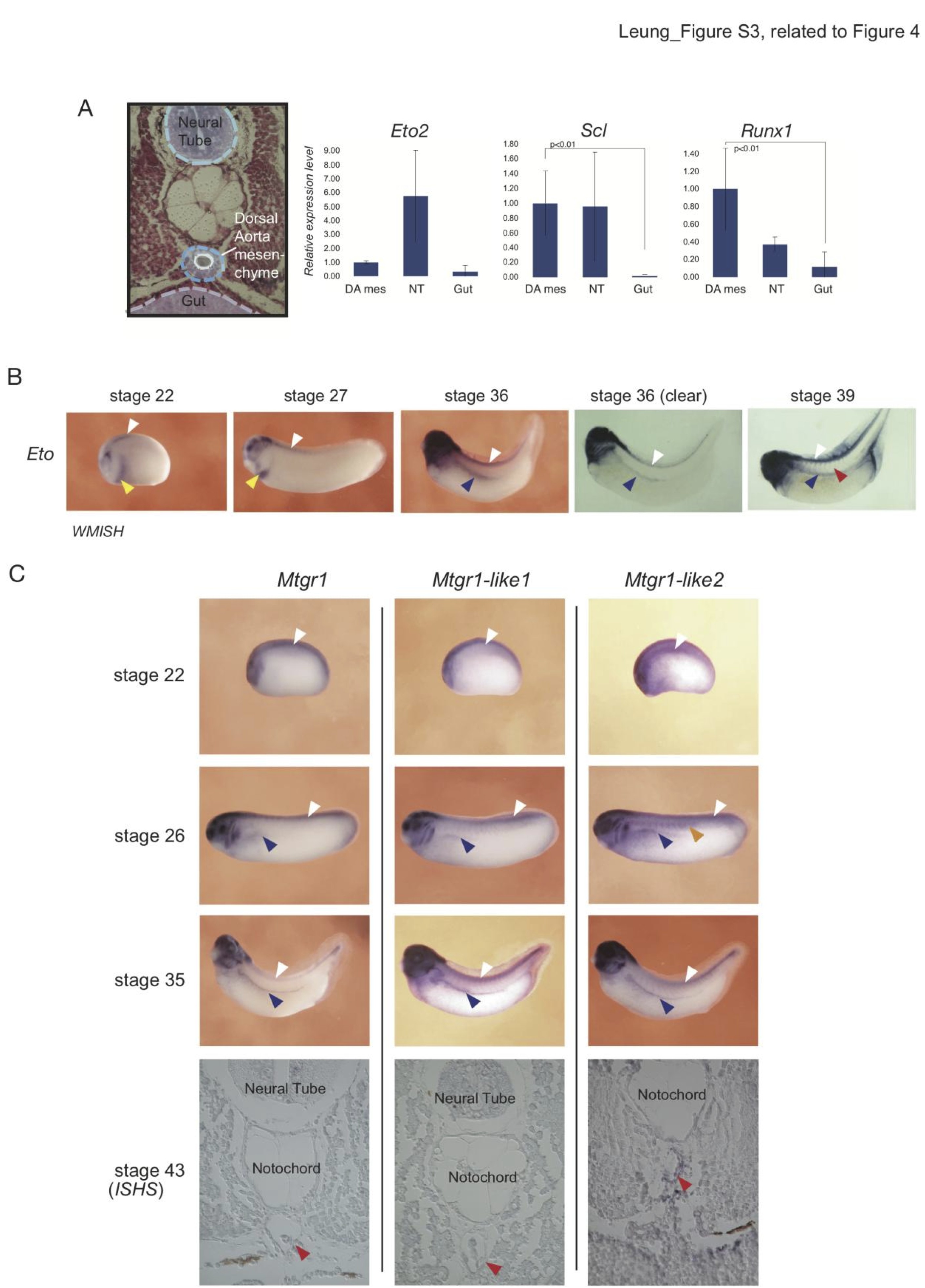 (A) Laser Capture Microdissection (LCM) was used to isolate specific tissues from stage 39 embryonic sections; the DA and surrounding mesenchyme (DA mes), the neural tube (NT) and gut. NT tissues were intended as a positive control for amplification of the Eto2 transcripts and the gut as a negative control (as expected from WMISH and ISHS results, Figure 4). Gene expression analysis was carried out for Eto2 and the known HSC markers Scl and Runx1 by Reverse Transcription Real Time PCR. Results were normalised to ODC. Errors bars represent the standard deviation from two independent experiments. Unlike the HSC markers, Eto2 expression in the DA mesenchyme is not significantly different from that observed in gut when compared to the high levels observed in the NT.