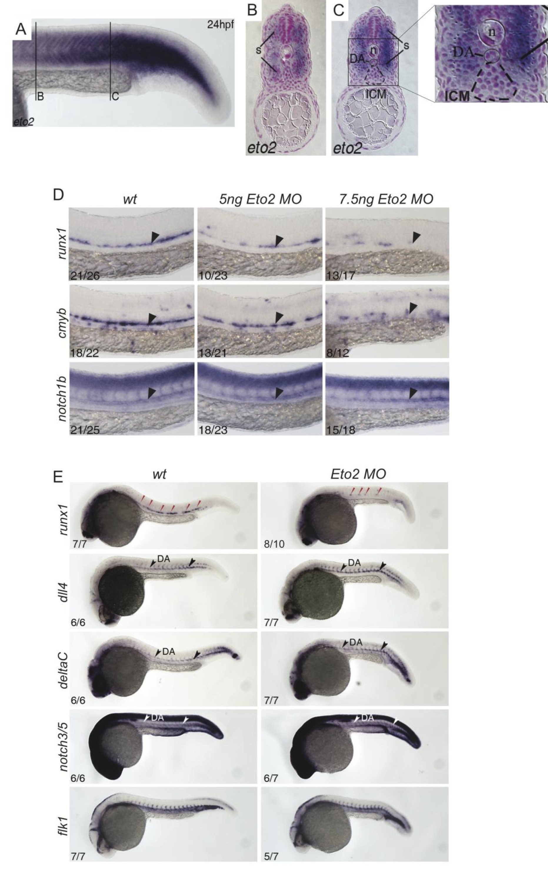 (A-C) As in Xenopus, Eto2 is expressed in the trunk somites (A) but not in the dorsal aorta (DA), as seen in transverse sections along the trunk (B, C), at 24hpf (hours post-fertilisation); s, somites; ICM, intermediate cell mass. (D) To test the function of ETO2 in hematopoietic development, we knocked- down its expression using a morpholino that targets the zebrafish Eto2 (Meier et al. 2006). A dose- dependent loss of the HSC markers runx1 and cmyb (another HSC marker (Murayama et al. 2006)) in the DA (black arrowheads) was observed with increasing amounts of Eto2 MO, at 28hpf. In contrast, expression of the arterial marker notch1b was unaffected. (E) At 28hpf, none of the arterial markers analysed (dll4, dlC, notch3/5; DA, black and white arrowheads (Lawson and Weinstein 2002; Nicoli et al. 2008; Rowlinson and Gering 2010)) was affected in Eto2 morphants, whereas runx1 expression was severely downregulated (red arrowheads). Flk1 expression is grossly normal in Eto2 morphants confirming normal endothelialisation. Therefore, down-regulation of Eto2 in zebrafish embryos leads to non cell-autonomous phenotypic defects that are very similar to those observed in Xenopus Eto2 morphant embryos. Image published in: Leung A et al. (2013) © 2013 ELL & Excerpta Medica. Creative Commons Attribution license Larger Image Printer Friendly View |