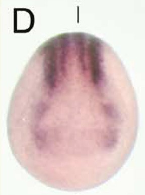 Larger Image gdf10 (growth differentiation factor 10) gene expression in Xenopus laevis embryo, assayed via in situ hybridization, NF stage 14, anterior view, dorsal up. This image is extracted from figure published in: Hino J et al. (2003), Image published in: Hino J et al. (2003) Copyright © 2003. Image reproduced with permission of the Publisher, Elsevier B. V.