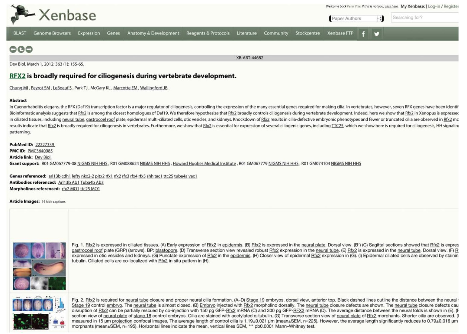 | Larger Image FIG. 5. Literature page. In addition to features such as title, authors, and abstract, Xenbase publications also display lists of genes cited, antibodies, and morpholinos referenced (with hyperlinks to these separate resource pages). All anatomical features (e.g., neural tube) identified by text-mining for XAO terms are hyperlinked, as are gene symbols (e.g., Rfx2). Author names are also linked to pages in our community module and through this, to the author’s other publications. Image published in: James-Zorn C et al. (2015) Copyright © 2015. Image reproduced with permission of the Publisher, John Wiley & Sons. Permanent Image Page Printer Friendly View XB-IMG-145539 |