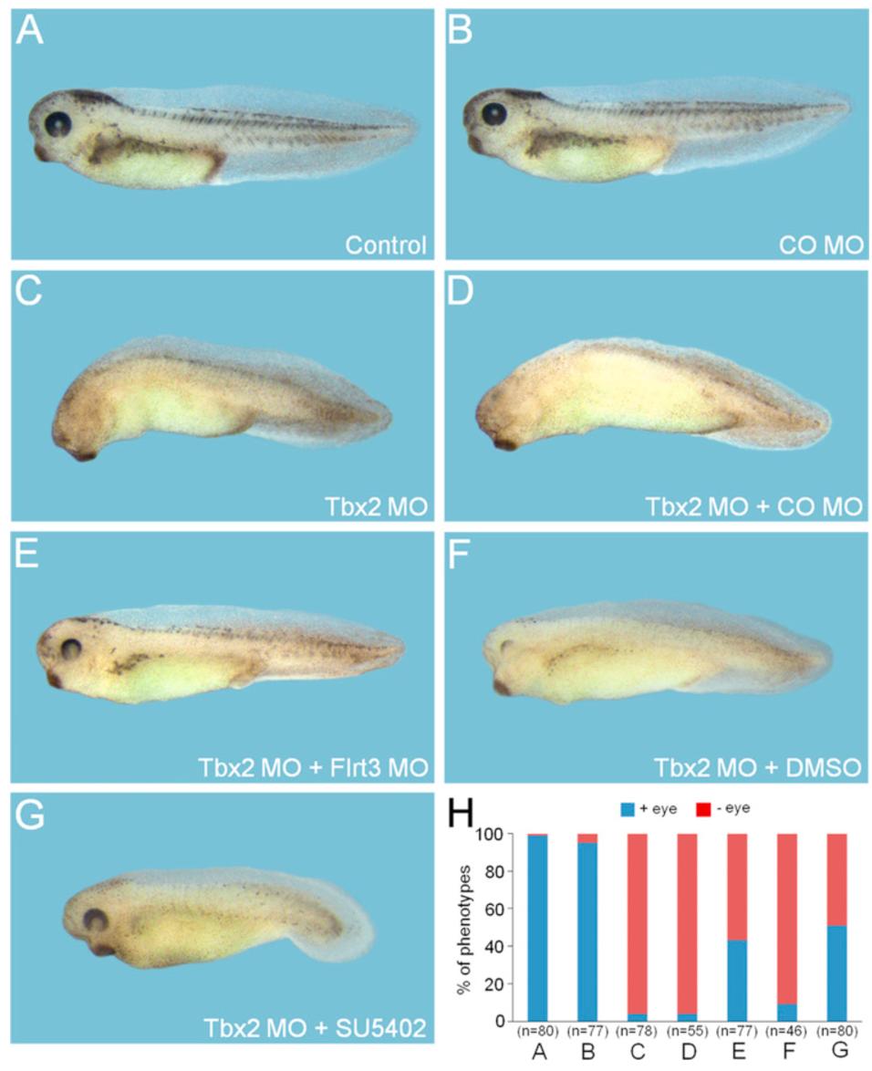 Larger Image Fig. 6. Tbx2 inhibition of FGF signaling is critical for formation of head structures. (A-G) Four-cell stage embryos were injected in the animal region as indicated with Tbx2 MO (40 ng), CO MO (60 ng) and Flrt3 MO (60 ng) and cultured to tadpole stages with or without chemical treatment. SU5402 (20 μM) or DMSO was treated to the injected embryos from stage 15â20. Control, an uninjected embryo. Lateral views with anterior to the left. (H) Quantification of the phenotypes shown in (A-G) in terms of eye formation. n, the total number of embryos analyzed. + eye, embryo with eyes; - eye, embryo with no eyes. Image published in: Cho GS et al. (2017) Copyright © 2017. Image reproduced with permission of the Publisher, Elsevier B. V. Permanent Image Page Printer Friendly View XB-IMG-154070 |