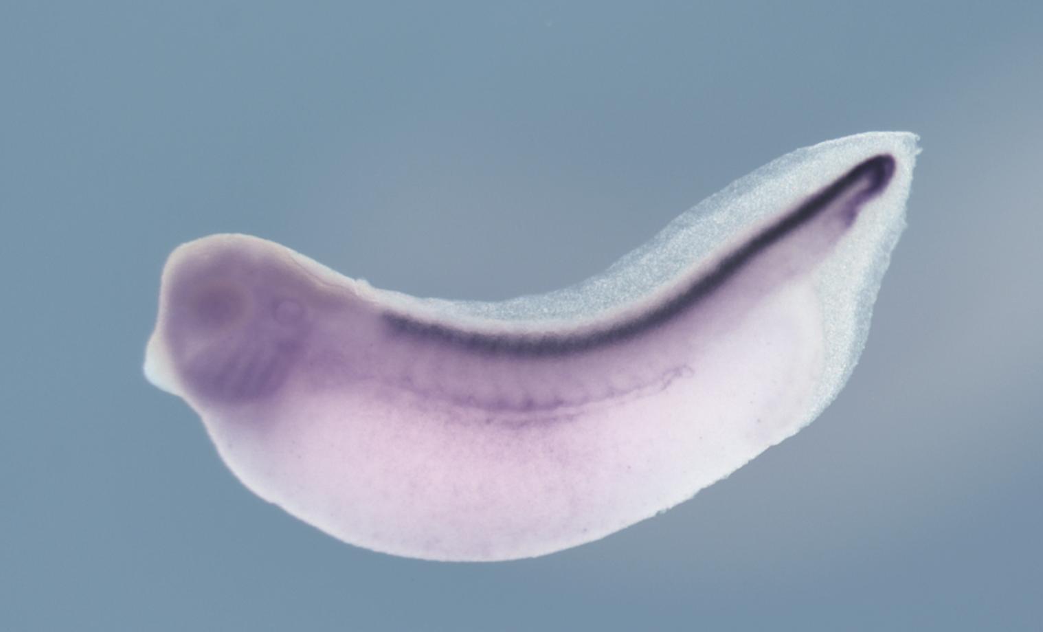 | Larger Image hoxb9 (homeobox B9) gene expression in Xenopus laevis embryo, assayed via in situ hybridization, NF stage 37 & 38, lateral view, anterior left, dorsal up. Copyright © Soeren S Lienkamp Image created by: Soeren S Lienkamp