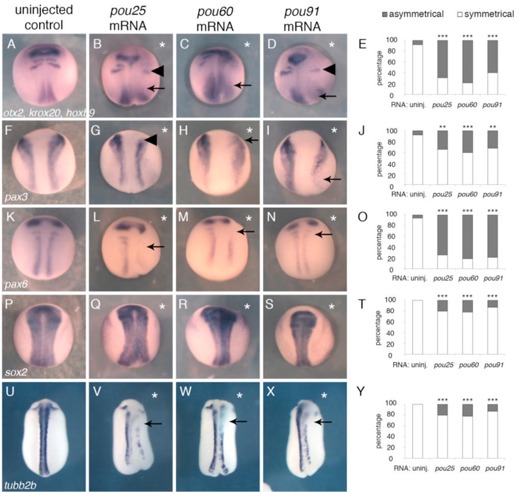 Larger Image Fig. 5. Neural patterning and differentiation are disrupted upon pou5f3 overexpression. Injection of individual pou5f3 mRNAs causes changes in neural marker gene expression, as assayed by whole-mount RNA in situ hybridization at stages 16 (A-T) and 23 (U-Y) using markers otx2, krox20, and hoxb9 in combination (A-D), pax3 (F-I), pax6 (K-N), sox2 (p-S), and tubb2b (U-X); dorsal view, anterior up. Asterisks in images indicate injected side; arrows indicate partial loss of expression; arrowheads indicate posterior shifts in expression. Quantification (E, J, O, T, and Y) shows the percentage of embryos with symmetrical (white bars) or asymmetrical (grey bars) neural gene expression. n >30 embryos per experimental condition; **, p<0.01, *** p<0.001 by pairwise chi-squared test. Image published in: Exner CRT et al. (2017) Copyright © 2017. Image reproduced with permission of the Publisher, Elsevier B. V.