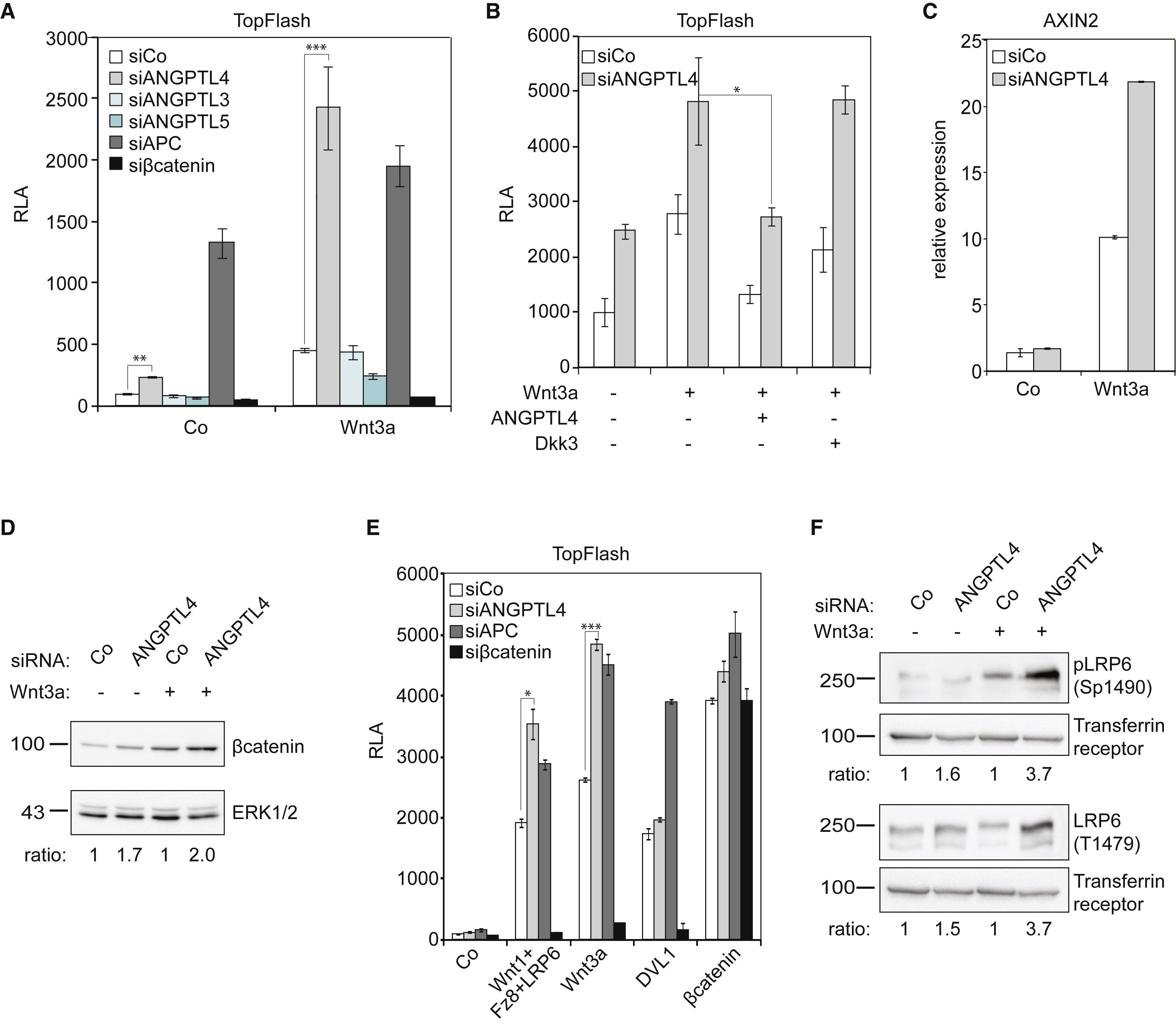 Larger Image Figure 1. Angiopoietin-like 4 Inhibits Wnt/b-Catenin Signaling at the Receptor Level (A) Wnt luciferase reporter assay in H1703 cells transfected with the indicated siRNAs, followed by treatment with Wnt3a or control (Co) conditioned medium. siAPC and sibcatenin were included as positive and negative control, respectively. (B) Wnt reporter assay in HEK293T cells transfected with siANGPTL4 or control, followed by treatment with the indicated conditioned media. (C) qRT-PCR analysis of AXIN2 expression in H1703 cells transfected with the indicated siRNAs. (D) Western blot analysis of cytosolic b-catenin in H1703 cells, following transfection with the indicated siRNAs and treatment with control (Co) or Wnt3a conditioned medium. (E) Wnt reporter epistasis assay in HEK293T cells. Cells were transfected with the indicated plasmids or siRNAs. (F) Western blot analysis of (activated) phospho-LRP6 in H1703 membrane fractions. Cells were treated with the indicated siRNAs, followed by treatment with Wnt3a or control (Co) conditioned medium. Data in all graphs are displayed as means ± SD, and show one representative of multiple independent experiments with three biological replicates. RLA, relative luciferase activity. *p < 0.05; **p < 0.01; ***p < 0.001. See also Figure S1. Image published in: Kirsch N et al. (2017) Copyright © 2017. Image reproduced with permission of the Publisher, Elsevier B. V. Permanent Image Page Printer Friendly View XB-IMG-159351 |