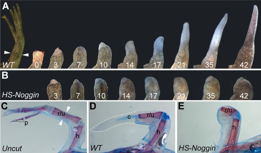 | Larger Image Figure 4. Regeneration of the froglet forelimb. A: A normal froglet forelimb has 4 digits (far left). Amputation of the Xenopus froglet forelimb midway along the forearm (zeugopod, white arrowheads) results in epimorphic regeneration of a hypomorphic spike. Regenerative progress is shown at 0 (time of cutting) to 42 days afterward. From days 0-3, soft tissue contracts away from the wound surface and the wound becomes covered. A blastema is present by day 7 and extends distally forming a spike. B: In transgenic animals in which the Bmp signalling pathway is inhibited by induction of ectopic noggin expression with daily heat shocks over 14 days, regeneration of the spike is completely inhibited. C: Skeletal preparation of a normal froglet forelimb showing the ossified bone in red and the cartilage in blue (alizarin red S/alcian blue). The white arrowheads show the position of amputation. D: Skeletal preparation of normal wild-type regenerating forelimb after 42 days. The extent of the regenerated spike is outlined by white dots. Only cartilage is present in the spike, and there are no joints. E: Bmp inhibited animals show no regeneration of cartilage or other soft tissues. c, cartilage; h, humerus; r/u, radius and ulna; p, phalanges. Image published in: Beck CW et al. (2009) Copyright © 2009. Image reproduced with permission of the Publisher, John Wiley & Sons. Permanent Image Page Printer Friendly View XB-IMG-26348 |