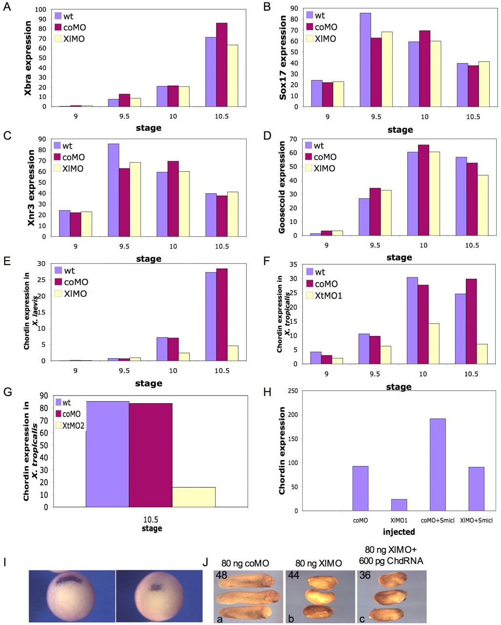 Larger Image Fig. 3. Inhibition of Smicl function causes down regulation of Chordin expression, but not of other mesodermal and endodermal markers. (A-E) Expression levels, normalised to that of ornithine decarboxylase, of Xbra (A), Sox17 (B), Xnr3 (C), Goosecoid (D) and Chordin (E) in uninjected embryos, embryos injected with morpholino oligonucleotide coMO (80 ng), or embryos injected with morpholino oligonucleotide XlMO (80 ng). RNA was extracted at the indicated stages, and RNA levels were analysed by quantitative RT-PCR. (F,G) Inhibition of Smicl function by means of morpholino oligonucleotide XtMO1 (5 ng; F) or XtMO2 (30 ng; G) also causes downregulation of Chordin expression in Xenopus tropicalis. Embryos were assayed at stages 9, 9.5, 10 and 10.5 (F), or at stage 10.5 (G). (H) Injection of RNA encoding mouse Smicl causes the upregulation of Chordin in embryos injected with morpholino oligonucleotide coMO and rescues the downregulation of Chordin caused by morpholino oligonucleotide XlMO. Embryos were injected with the indicated RNAs (1 ng) or morpholino oligonucleotides (50 ng). RNA was extracted at stage 10.5 and expression of Chordin and ornithine decarboxylase was assayed by quantitative RT-PCR. (I) In situ hybridisation of Xenopus laevis embryos at the early gastrula stage confirms that inhibition of Smicl function causes the downregulation of Chordin. The embryo on the left was injected with coMO (80 ng; n=15) and the one on the right with XlMO (80 ng; n=15). (J) Injection of Chordin mRNA can partially rescue the phenotype caused by XlMO. Numbers indicate how many embryos out of 50 display this phenotype. Image published in: Collart C et al. (2005) Copyright © 2005. Image reproduced with permission of the Publisher and the copyright holder. This is an Open Access article distributed under the terms of the Creative Commons Attribution License.