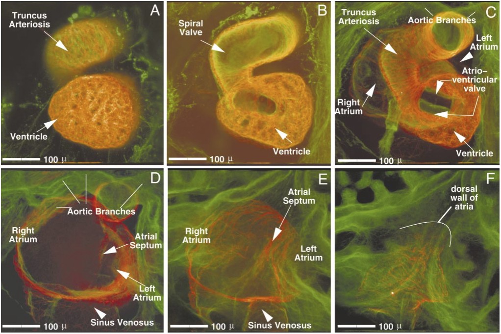 Larger Image FIG. 5. Ventral-to-dorsal progression through a stage 46 Xenopus heart. Images were digitally created from a series of 48 optical sections (taken 5um apart) through a double-labeled stage 46 Xenopus heart (red, CT3; green, JB3). Image A represents the most ventral 8 images of this series, digitally merged; image B, the next 8, etc. The relative positioning of heart structures to one another, as well as an individual structure order of emergence within the series, can be established: the truncus arteriosus and ventricle are always most ventral (A). Progressing dorsally, the spiral valve (B) appears within the truncus. Next, the single atrioventricular valve (C) is seen overlying the atrial septum (D and E). Midway through the series (C and D), the first views of the atria, as well as the aortic branches, are viewed. Both atria and the sinus venosus are seen more dorsally (D and E). Finally, the back wall of the atria is seen, positioned most dorsal (F). Scale bar, 100 um. Image published in: Kolker SJ et al. (2000) Copyright © 2000. Image reproduced with permission of the Publisher, Elsevier B. V.