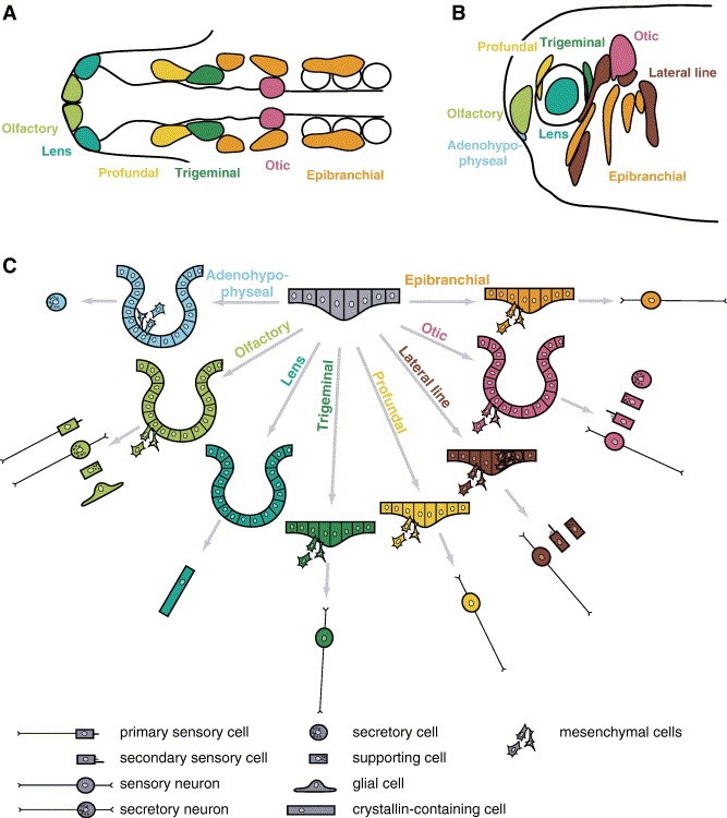 Larger Image Fig. 1. Cranial placodes in vertebrates. (A) Cranial placodes in a 10- to 13-somite-stage chick embryo (modified from Streit, 2004; based on D'Amico-Martel and Noden, 1983; Bhattacharyya et al., 2004). In amniotes, profundal and trigeminal placode are commonly referred to as ophthalmic and maxillomandibular placode of the trigeminal nerve, respectively. (B) Cranial placodes in a tailbud stage Xenopus embryo (modified from Schlosser and Northcutt, 2000). (C) Schematic summary of morphogenesis and cellular derivatives of various cranial placodes. Invagination occurs in adenohypophyseal, olfactory, lens, and otic placodes. Moreover, in all placodes except the lens placode, some cells migrate away from the placodal epithelium as mesenchymal cells to form sensory neurons, secretory cells, or glial cells. In lateral line placodes, another subset of cells migrates along the basement membrane and forms the lateral line primordia (modified from Schlosser, 2005). Image published in: Schlosser G (2006) Copyright © 2006. Image reproduced with permission of the Publisher, Elsevier B. V. Permanent Image Page Printer Friendly View XB-IMG-84068 |