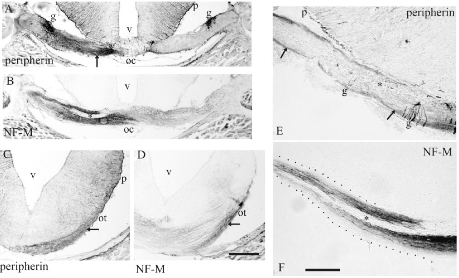 Larger Image Fig. 6. Immunocytochemical localization of peripherin in regenerating axons. Transverse sections through the brains of frogs sacrificed 28 days (AâD) and 21 days (E,F) after optic nerve crush were immunostained with antibodies to a C-terminal peptide derived from Xenopus peripherin (diluted 1:1000: A,C,E) and to nonphosphorylated NF-M (S8 after phosphatase treatment, 1:1000: B,D; RMO270, 1:100: F). Dorsal side is up and the left side is at the left. A: At the optic chiasm, peripherin-containing fibers run longitudinally in the left, crushed optic nerve (arrow). In contrast, in the right, uncrushed optic nerve, peripherin is found only in clusters of glia cells (g). B: On a neighboring section, regenerating fibers growing outside the degenerating core (asterisk) stain strongly for NF-M. The degenerating core was not visible in A because of the level of sectioning. C: A more posterior section of the same animal as in A and B shows peripherin containing fibers in the contralateral optic tract of the diencephalon (arrow). D: A neighboring section to that in C shows the distribution of NF-M for comparison. E: In the operated optic nerve close to the chiasm, peripherin is present in the youngest regenerating axons (arrows), which are located close to the glia limitans, but is absent in the oldest regenerating axons, which are found close to the degenerating core (asterisk). F: On a section adjacent to that shown in E, NF-M is present in older regenerating axons, but is absent from young regenerating axons close to the glial limitans (dots). g, glia; oc, optic chiasm; ot, optic tract; p, pial surface; v, ventricle. Scale bars 300 m in D (applies also to AâC) and 100 m in F (applies also to E). Image published in: Gervasi C et al. (2003) Copyright © 2003. Image reproduced with permission of the Publisher, John Wiley & Sons.