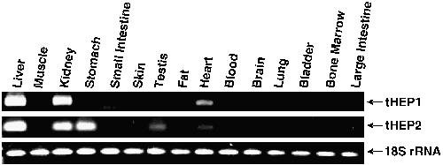 Differential expression of tHEP1 and tHEP2 in a normal adult X. tropicalis. Shown are RT-PCR results with tHEP1- and tHEP2-specific primers ( Fig. 1) and total RNA (30 ng) isolated from various tissues. For all RT-PCR reactions, a single RT-PCR product was seen on a 1.2% agarose gel after electrophoresis. 18 s rRNA was used as an internal control.