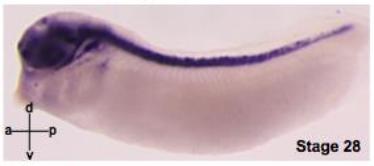 l1cam (L1 cell adhesion molecule) gene expression in Xenopus tropicalis embryo, assayed via in situ hybridization, NF stage 28, lateral view, anterior left, dorsal up. This image is extracted from figure published in: Date P et al. (2019), Image published in: Date P et al. (2019) © The Author(s) 2019. Creative Commons Attribution license