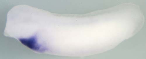 GATA binding protein 5 (gata5) gene expression in Xenopus tropicalis embryo, assayed via in situ hybridization, NF stage 28/29, lateral view, anterior left, dorsal up. Copyright © Harland Lab