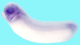 tcf7L1 (transcription factor 7-like 1 (T-cell specific, HMG-box) ) gene expression in Xenopus laevis embryo, NF stage 28, as assayed by in situ hybridization, lateral view, anterior left, dorsal up. This image is extracted from figure published in: van Venrooy S et al. (2008), Image published in: van Venrooy S et al. (2008) Copyright © 2008 van Venrooy et al; licensee BioMed Central Ltd. Creative Commons Attribution license