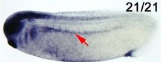 etv6 (ets variant transcription factor 6) gene expression in Xenopus laevis embryo, assayed via in situ hybridization, NF stage 26, lateral view, anterior left, dorsal up. This image is extracted from figure published in: Ciau-Uitz A et al. (2013), Image published in: Ciau-Uitz A et al. (2013) Copyright © 2013. Image reproduced with permission of the Publisher and the copyright holder. This is an Open Access article distributed under the terms of the Creative Commons Attribution License.