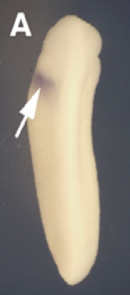 nodal1 (nodal homolog 1) gene expression in Xenopus laevis embryo, assayed via in situ hybridization, NF stage 27, dorsal view, anterior up.