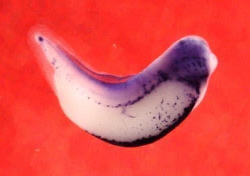 | lmo2 (LIM domain only 2 (rhombotin-like 1)) gene expression in Xenopus laevis embryo, assayed via in situ hybridization, NF stage 35 & 36, lateral view, anterior right, dorsal up. Copyright © Patient Lab Image created by: Aldo Ciau-Uitz