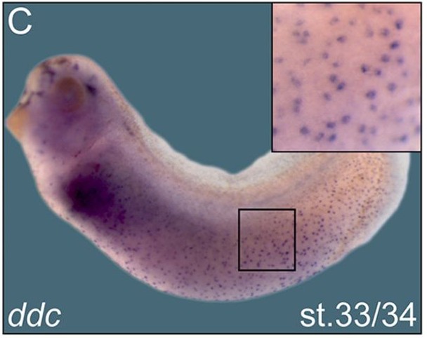 |   | ddc (DOPA-decarboxylase) gene expression in Xenopus laevis embryo, assayed via in situ hybridization, NF stage 34 & 35, lateral view, anterior left, dorsal up. This image is extracted from figure published in: Walentek P et al. (2014), Image published in: Walentek P et al. (2014) Copyright © 2014. Image reproduced with permission of the Publisher.