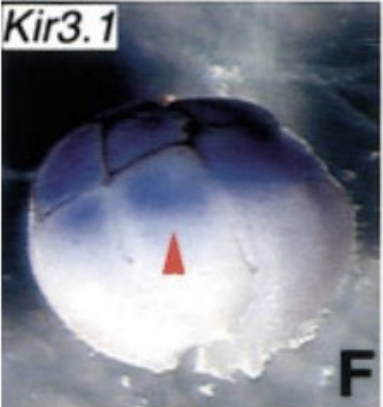 kcnj3.1 ( potassium inwardly rectifying channel subfamily J member 3) gene expression in Xenopus laevis embryo, assayed via in situ hybridization, NF stage 5 (16-cell), dorsolateral view. This image is extracted from figure published in: Rutenberg J et al. (2002), Image published in: Rutenberg J et al. (2002) Copyright © 2002. Image reproduced with permission of the Publisher, John Wiley & Sons.