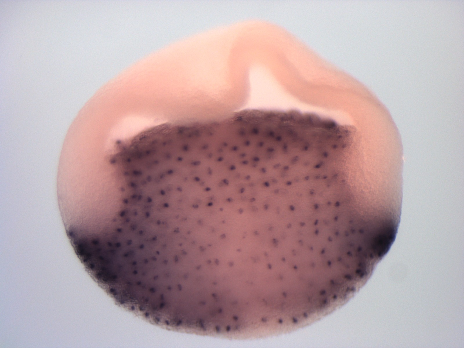 sox17a (SRY (sex determining region Y)-box 17 alpha ) gene expression in bisected Xenopus laevis/ tropicalis embryo, mid-sagittal section, assayed via in situ hybridization, NF stage 10, dorsal right, anterior up. Copyright © Zorn Lab