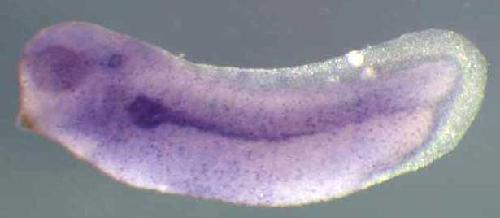 rab11a (RAB11A, member RAS oncogene family) gene expression in Xenopus tropicalis embryo, as assayed by in situ hybridization, NF stage 28/29&30 embryo, lateral view, anterior left, dorsal up. Copyright © Papalopulu Lab