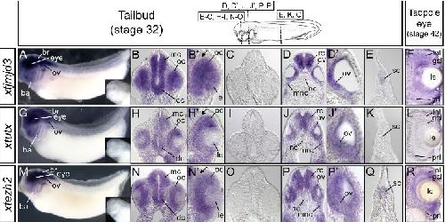 Fig. 4. Expression of xtjmjd3, xtutx and xtezh2 in tailbud embryos and tadpoles. (A,G,M) Lateral views of tailbud embryos subjected to whole-mount in situ hybridiza- tion. Insets show embryos hybridized with a sense probe for xtjmjd3, xtutx or xtezh2. (B-E,H-K,N-Q) Transverse sections sub- jected to in situ hybridization. The planes of the sections are illustrated in the top white box. (BHN High magnification views of eyes in the transverse sections shown in B, H, and N. Arrows indicate the outer layer of the optic cup. (C,I,O) Transverse sections hybridized with a sense probe for xtjmjd3, xtutx or xtezh2. (DJP High magnification views of otic placodes in the transverse sections shown in D, J and P. (F,L,R) Transverse sections of tadpole eyes subjected to in situ hybridization. br, brain;