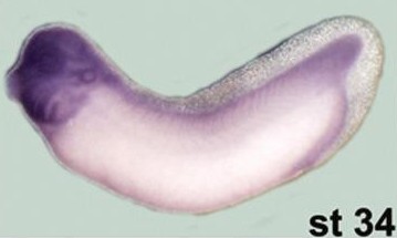 eed (embryonic ectoderm development) gene expression in Xenopus laevis embryos, NF stage 34, as assayed by in situ hybridization. Lateral view: anterior left, dorsal up. This image is extracted from figure published in: Aldiri I and Vetter ML (2009), Image published in: Aldiri I and Vetter ML (2009) Copyright © 2009. Image reproduced with permission of the Publisher, John Wiley & Sons.