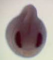 myb (v-myb myeloblastosis viral oncogene homolog) gene expression in Xenopus tropicalis embryos, NF stage 21, as assayed by in situ hybridization. Anterior view: dorsal up.