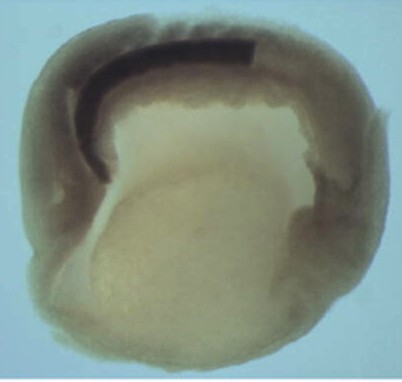 bmp1 (bone morphogenetic protein 1) gene expression in bisected Xenopus laevis embryo, mid-sagittal section, assayed via in situ hybridization, NF stage 18/19, dorsal right, anterior up. Image published in: Kenny AP et al. (2012) Copyright © 2012. Image reproduced with permission of the Publisher, Elsevier B. V.