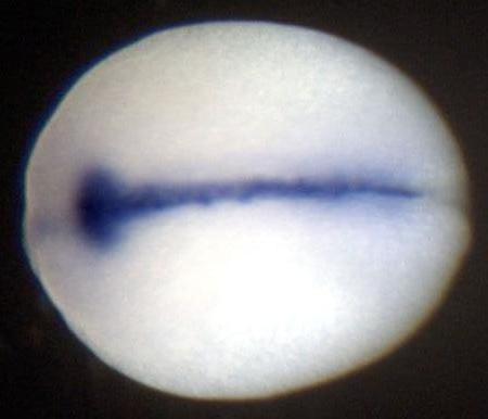 Larger Image shh (sonic hedgehog) expressed in Xenopus tropicalis embryo via in situ hybridization, stage 20, dorsal view, anterior left. Copyright © Harland Lab Image created by: Harland Lab