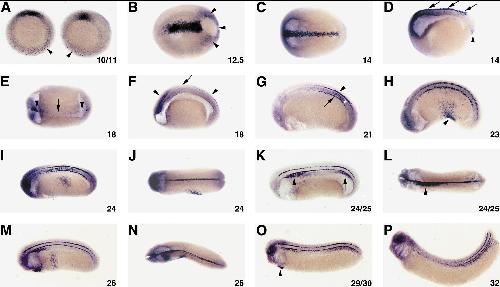 tailbud stages. (A) Vegetal pole view, dorsal at top. (B, C, E, J, L, and N) Dorsal view, anterior at left. (D, F, G, K, M, O, P) Left lateral view,