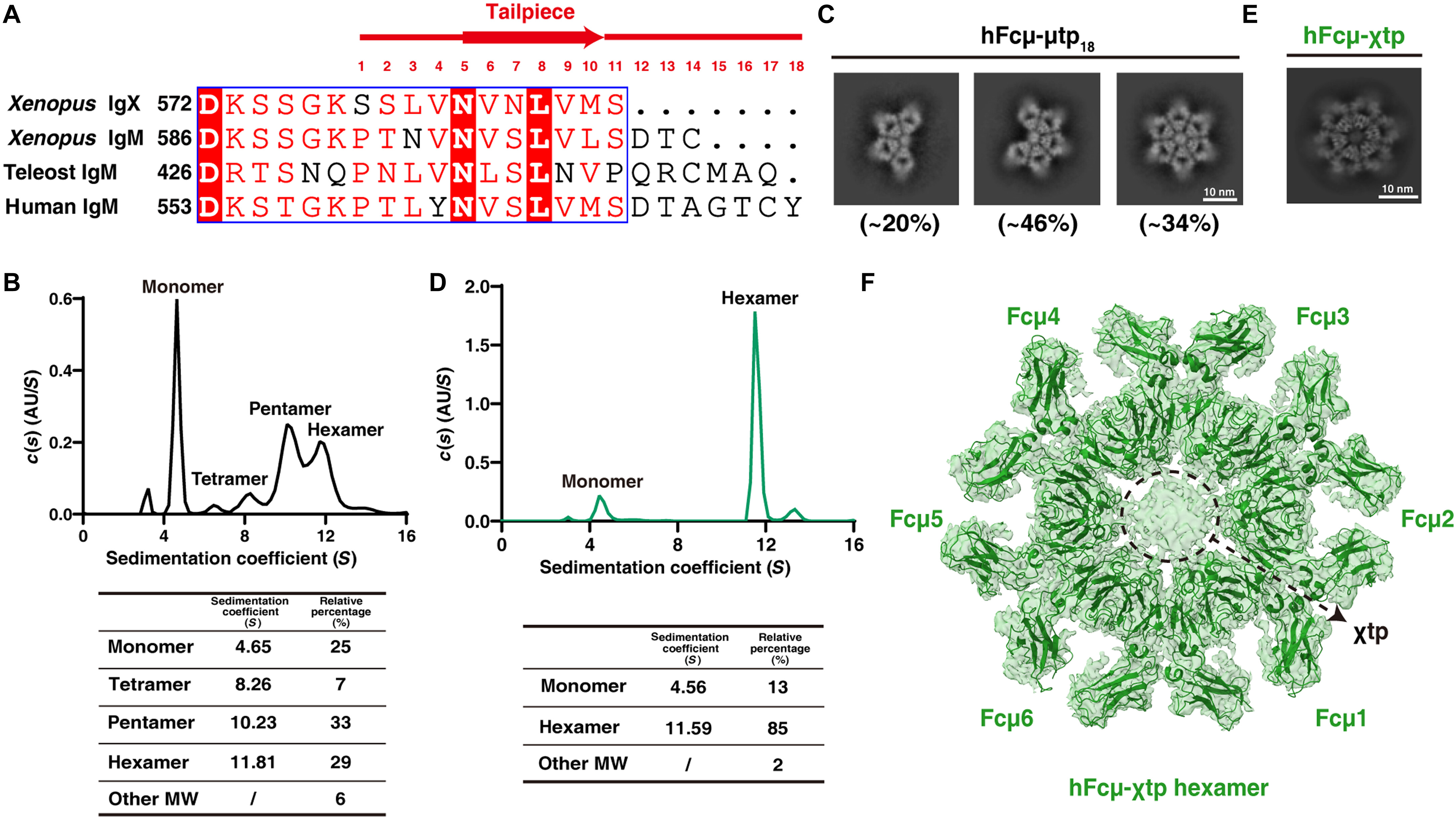 Fig. 2. The Fcμ-χtp chimera forms a hexamer.(A) Sequence alignment of the tailpiece regions of Xenopus IgX and IgM, teleost IgM (from Oncorhynchus mykiss), and human IgM. The tailpiece regions are highlighted. (B) SV-AUC analysis of Fcμ-μtp18 suggested that the monomer, tetramer, pentamer, and hexamer are all present in solution. AU, absorbance units. (C) 2D cryo-EM analyses suggested that the polymers of Fcμ-μtp18 consist of a mixture of tetramer, pentamer, and hexamer. (D) SV-AUC analysis indicated that the Fcμ-χtp polymer is uniformly hexameric in contrast to Fcμ-μtp18. (E) 2D cryo-EM analyses of the Fcμ-χtp chimera. (F) Cryo-EM reconstruction of the Fcμ-χtp hexamer at a 3.29-Å resolution. The EM density map is superimposed on the structural model.