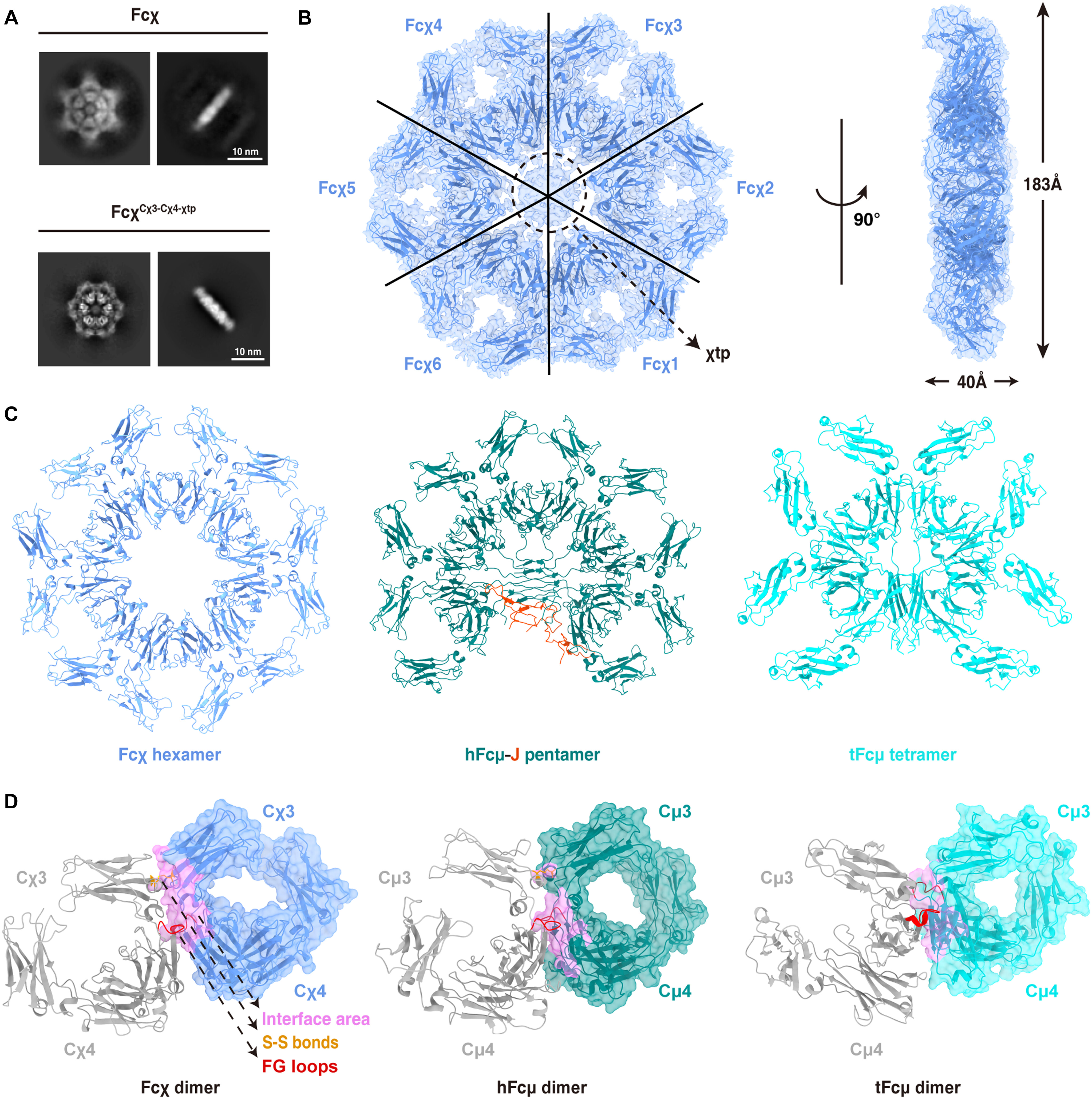 Fig. 1. Xenopus Fcχ can form a stable hexamer.(A) 2D cryo-EM analyses showed that both Fcχ and FcχCχ3-Cχ4-χtp form hexamers. (B) Cryo-EM reconstruction of the FcχCχ3-Cχ4-χtp hexamer at a 3.29-Å resolution, shown in two orientations. The EM density map is superimposed on the structural model. The χtp regions were not clearly resolved because of the blurred densities in this region, as indicated by a dashed circle. (C) Side-by-side comparisons of the Fcχ hexamer (blue), human Fcμ-J pentamer (Fcμ in teal and J-chain in orange), and teleost Fcμ tetramer (cyan). (D) Side-by-side comparisons of the Fc-Fc interactions in the Fcχ hexamer, human Fcμ-J pentamer, and teleost Fcμ tetramer. The interface area, the interchain disulfide bonds, and the FG loops of Cμ4 or Cχ4 domains are highlighted in pink, yellow, and red, respectively.