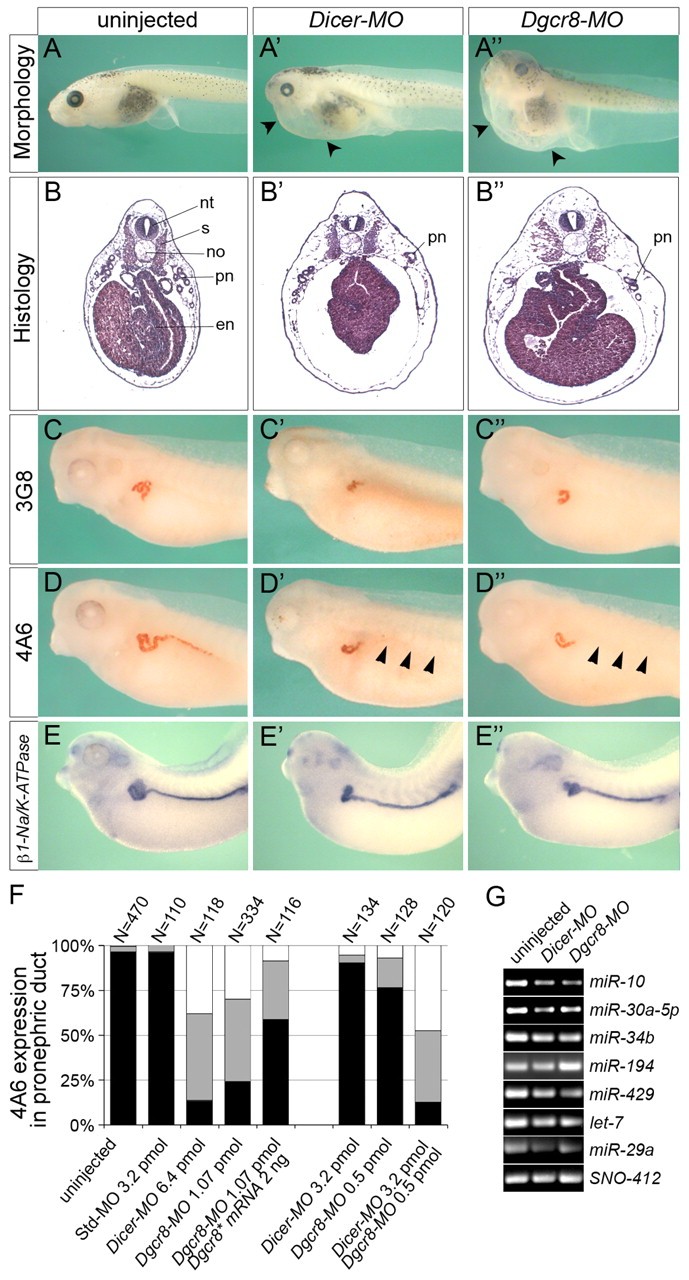 Fig. 1. Inhibition of miRNA biogenesis results in pronephric abnormalities. (A-Eâ²) Xenopus embryos were injected with 6.4 pmol Dicer-MO or 1.07 pmol Dgcr8-MO and compared with uninjected sibling embryos by morphology at stage 43 (A-Aâ²), histology with Hematoxylin and Eosin at stage 42 (B-Bâ²), immunostaining with 3G8 and 4A6 at stage 40 (C-Dâ²), and by whole-mount in situ hybridization for β1-Na/K-ATPase at stage 39 (E-Eâ²). Arrowheads indicate edema formation (Aâ²,Aâ²) and the loss of 4A6 staining in duct (Dâ²,Dâ²). en, endoderm; no, notochord; nt, neural tube; pn, pronephros; s, somites. (F) Quantification of 4A6 staining in the pronephric duct, comparing uninjected control embryos with embryos injected with a standard control MO (Std-MO), Dicer-MO, Dgcr8-MO, a combination of Dicer-MO and Dgcr8-MO, or Dgcr8-MO together with Dgcr8* mRNA at stage 40. The graph represents the summary of at least three independent experiments. The number (N) of embryos analyzed is indicated above the bars. Black, normal expression; gray, partial expression; white, no expression. (G) RT-PCR analysis of multiple miRNAs after Dicer and Dgcr8 knockdown at stage 35. SNO-412 served as loading control.
