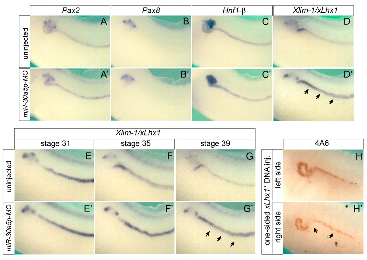Fig. 6. Xlim1 is regulated by miR-30a-5p. (A-Dâ²) Whole-mount in situ hybridization for Pax2 (A,Aâ²), Pax8 (B,Bâ²), Hnf1-β (C,Câ²) and Xlim1 (D,Dâ²), comparing uninjected and miR-30a5p-MO-injected Xenopus embryos at stage 39. (E-Gâ²) Whole-mount in situ hybridization for Xlim1 mRNA of uninjected and miR-30a5p-MO-injected Xenopus embryos at stages 31, 35 and 39. Note that Xlim1 expression is maintained at a higher level in miR-30a5p-MO-injected embryos after stage 35, when endogenous expression of miR-30a-5p can first be detected (arrows in Dâ²,Gâ²). (H,Hâ²) Immunohistochemistry with 4A6 of stage 40 embryos injected with 4 pg pCS2-Lhx1* DNA into one blastomere at the 4-cell stage, comparing the left with the right side. Arrows indicate changes in 4A6 staining. Ectopic expression of Lhx1 mRNA transcribed from the pCS2-Lhx1* was confirmed by in situ hybridization (data not shown).