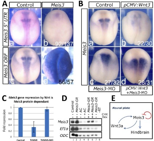 Fig. 2. Wnt3a represses Meis3 expression via auto-regulation by Meis3 protein. (A)Meis3-5'UTR (a,b) and Meis3-ORF (c,d) expression in mid-neurula embryos injected at the one-cell stage with high levels of Meis3 mRNA (1 ng). (B)Meis3-5'TR expression in mid-neurula embryos injected at the one-cell stage with Wnt3 CMV-driving plasmid (60 pg; pCMV:Wnt3; b) or Meis3-MO (30 ng; c), or both (d). (C)RT-PCR to endogenous Meis3 (Meis3-5'UTR primers) in AC explants from embryos injected with THVGR mRNA (50 pg) or Meis3-MO (30 ng), or both. RNA was isolated from a pool of 18 mid-neurula explants in each group. Results were quantified, normalized to Ef1-alpha loading control and plotted as fold-repression. Bars are s.e.m. from three independent experiments. (D)CHX assay and RT-PCR in embryos (lanes 1-2) and AC explants (lanes 3-7) injected with Meis3-GR mRNA (250 pg). At early gastrula stages, 5uM CHX was added to explant medium 2 hours prior to Dex activation (1uM). Explants were analyzed at late gastrula stages. Unactivated Meis3-GR shows no leaky activity. Ef1-alpha is a positive control for CHX activity, ODC is a loading control. T samples showed no DNA contamination. (E)A schematic summary of the results.