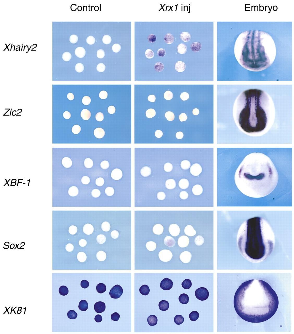 Fig. 7. Xrx1 induces Xhairy2 but does not affect several other markers in animal caps. Xrx1 injected animal caps were dissected at stage 9, cultured to stage 17 and analyzed for the expression of the indicated genes. The column on the right (Embryo) shows the expression of the indicated genes in control embryos.