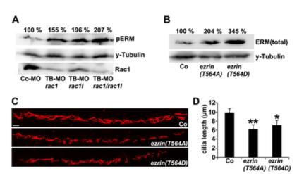 Supplemental Fig. S9. Rac1 and Rac1l regulate ERM phosphorylation and overexpression of Ezrin(T564A) or Ezrin(T564D) impaires ciliogenesis in zebrafish